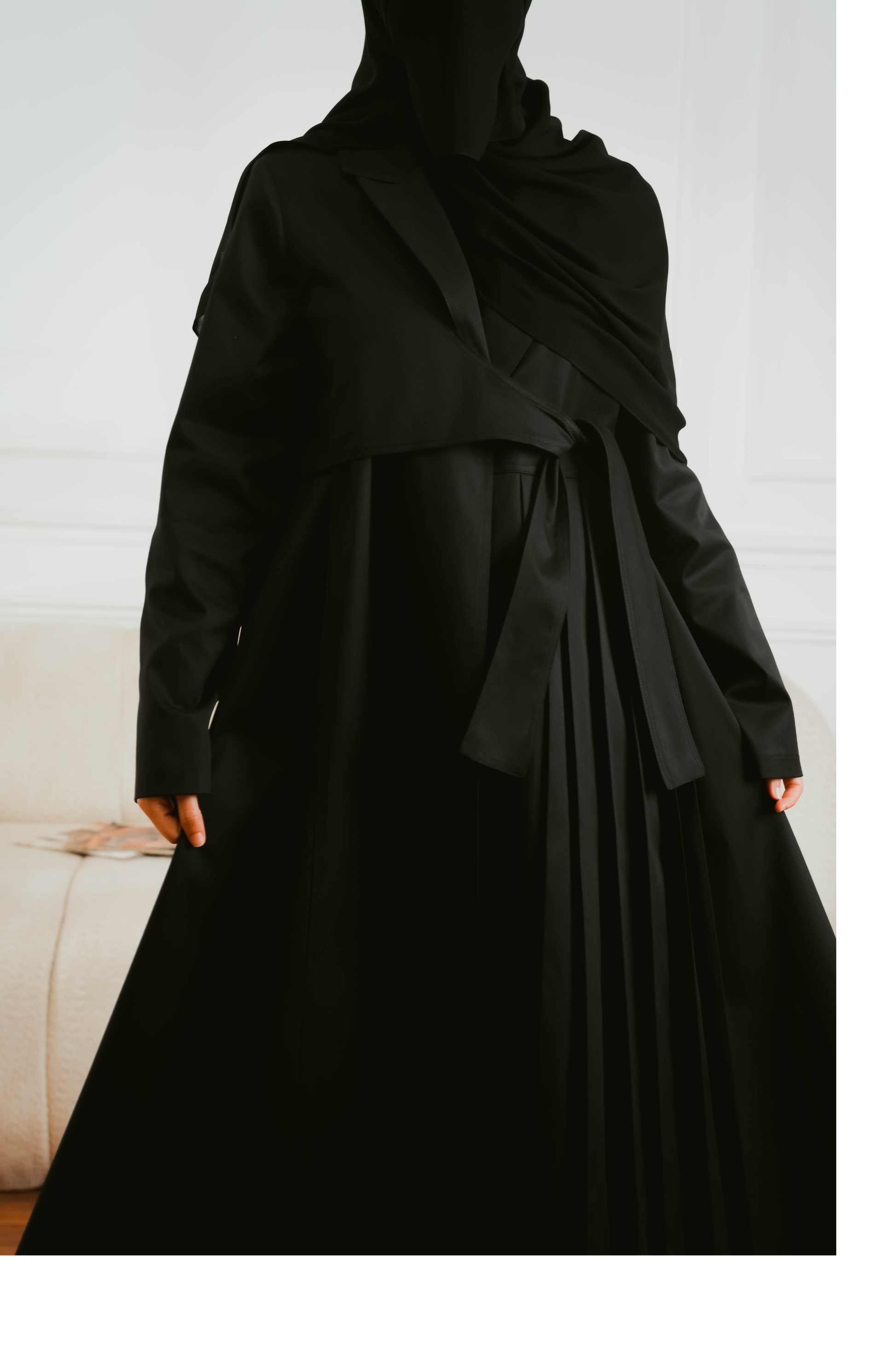 تتميز بكسرات جانبية ناعمة تضيف انسيابية وحركة جميلة، مع حزام جانبي يعطي لمسة أنثوية متزنة ويمكن تنسيقه بمرونة.