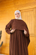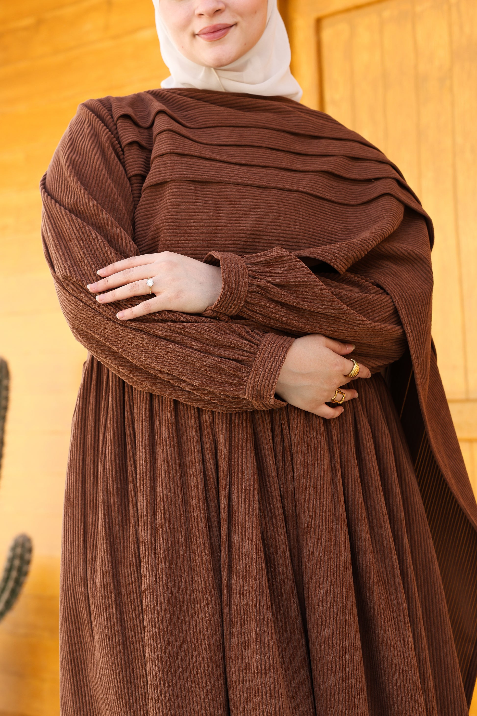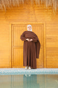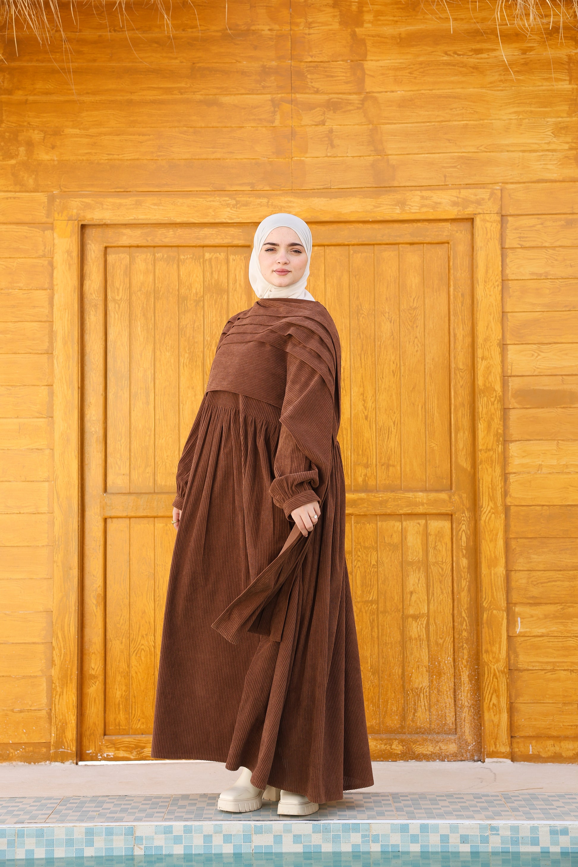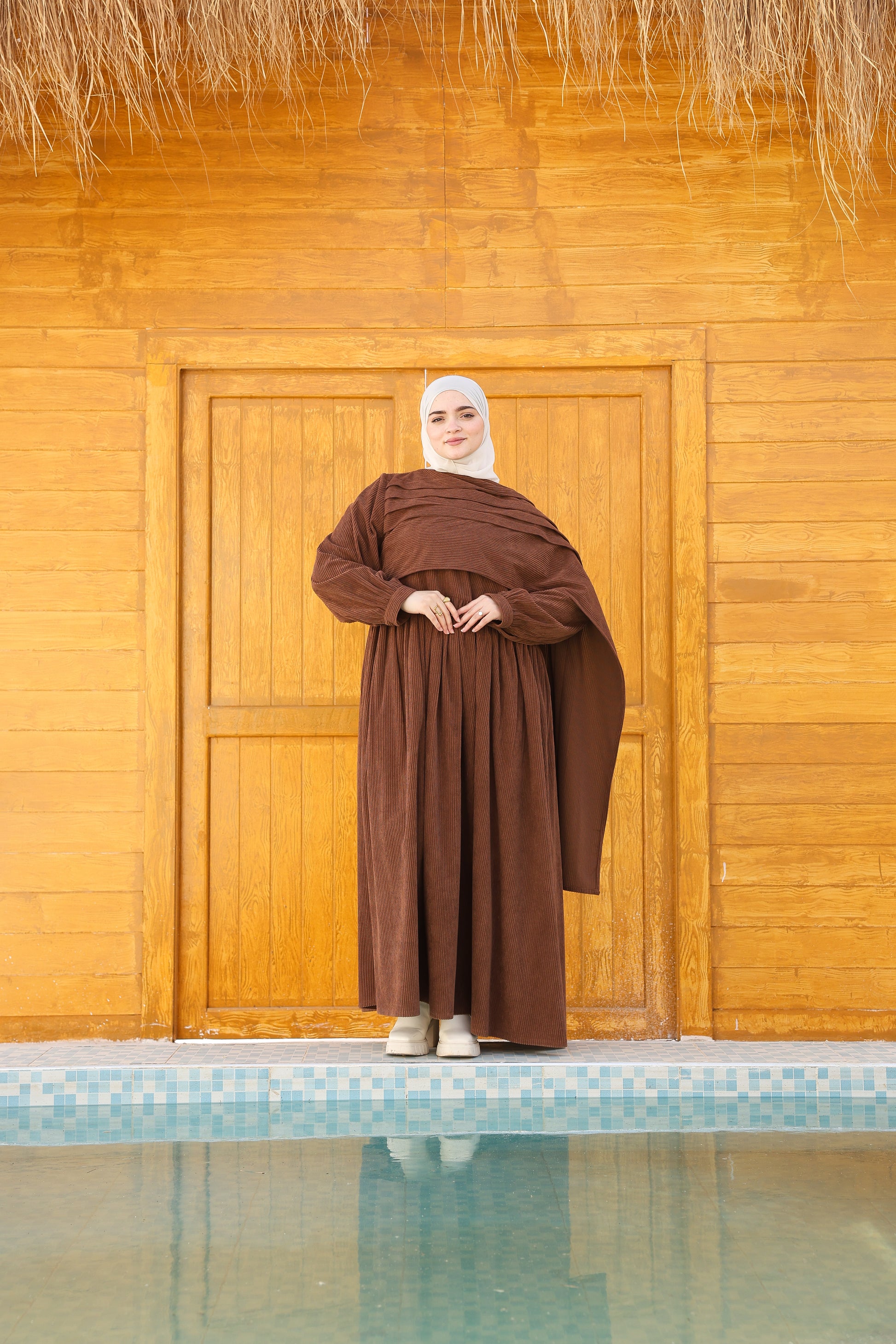 فستان عيد أنيق مصنوع من قماش القطيفة المضلع الناعم، يتميز بقصة واسعة تمنح راحة وأناقة في آنٍ واحد. مزود بقطعة شال على الكتف تضيف لمسة فخامة وجمال للتصميم، مع حزام قابل للتعديل للتحكم في الوسع وتحديد القوام بطريقة أنيقة. مناسب لإطلالات العيد الراقية والمريحة.